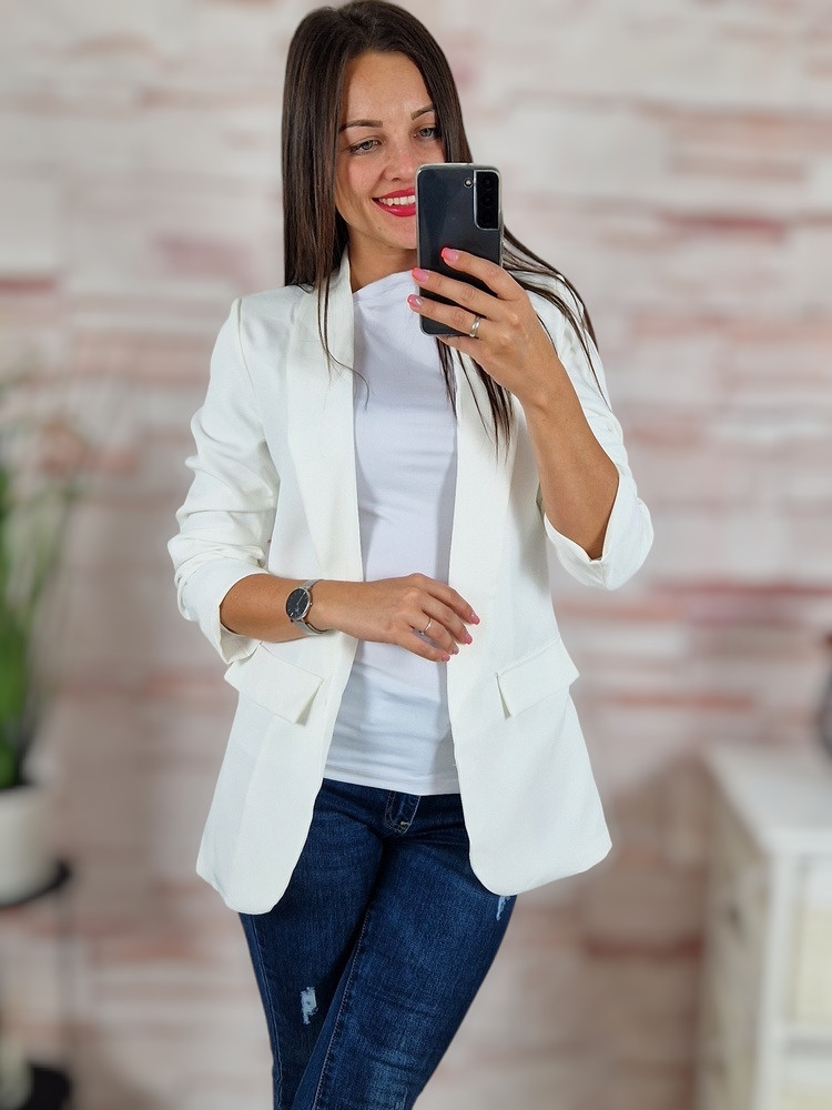 Karcsúsított, húzott ujjú, válltöméses fehér blézer S-XL-ig