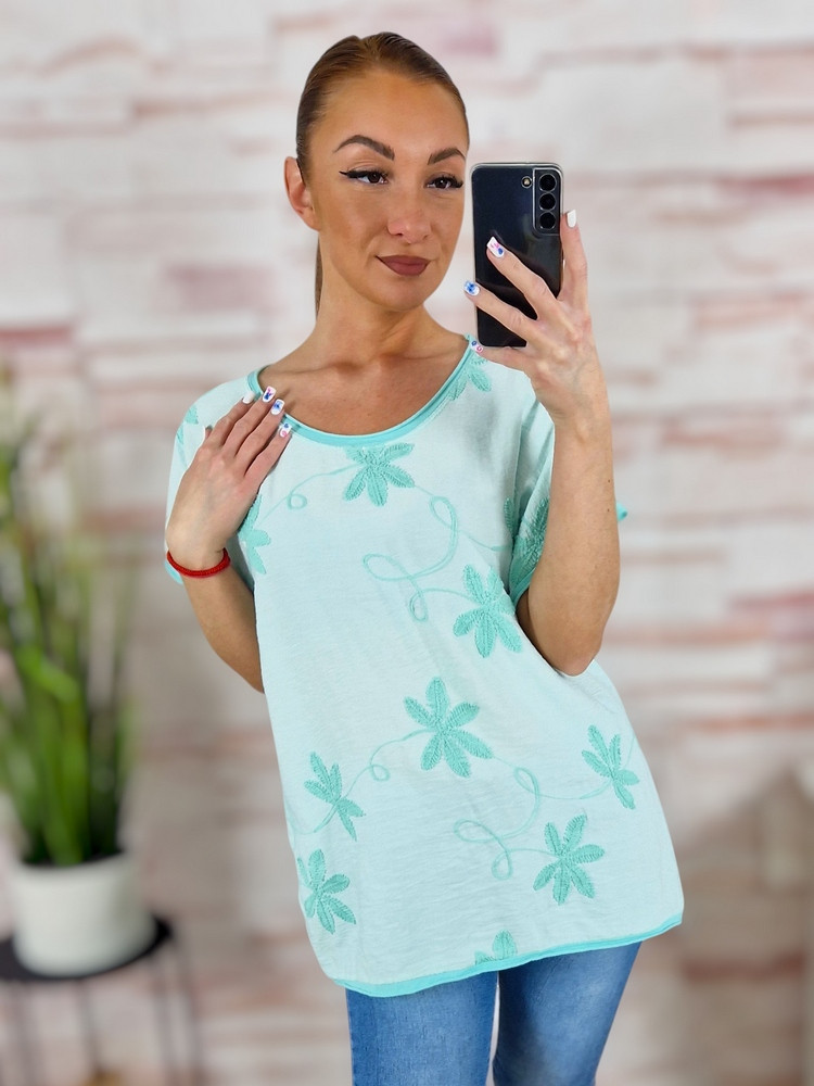 Virágmintás hímzett díszítésű, rövid ujjú felső L-XL