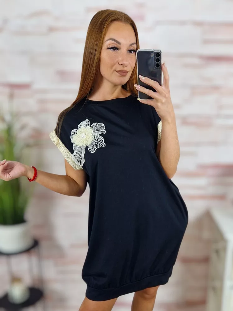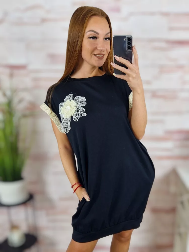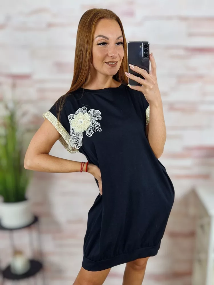 Zsebes, virágmintás díszítésű, rövid ujjú ruha M-L