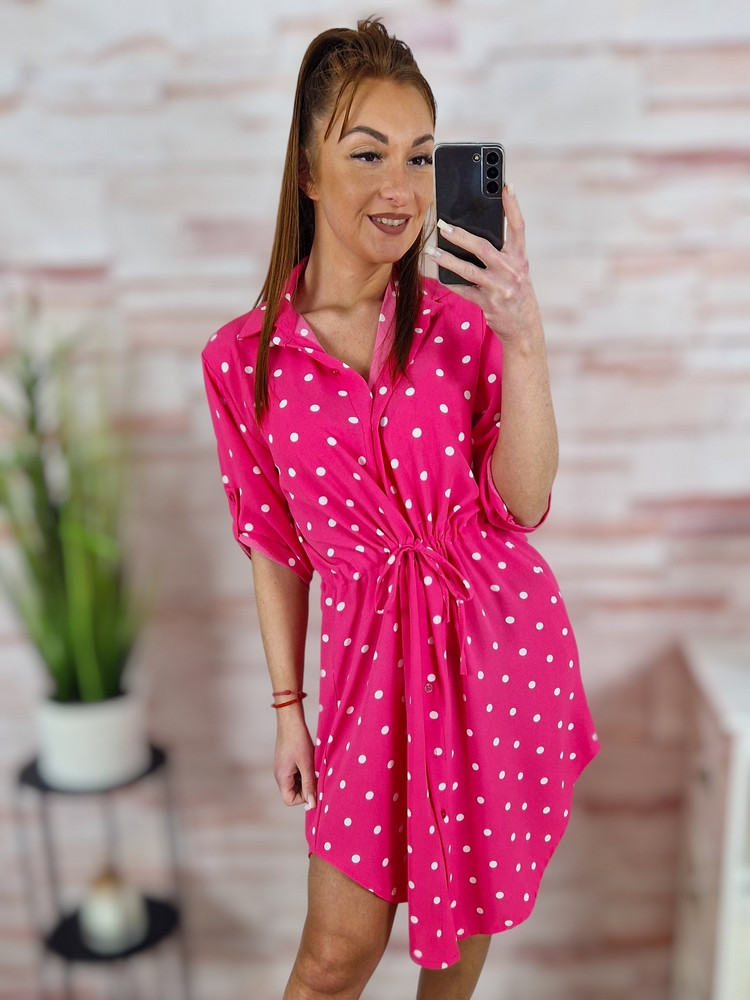 Pöttyös, deréknál összehúzható, roll-up ujjú ingruha M-L