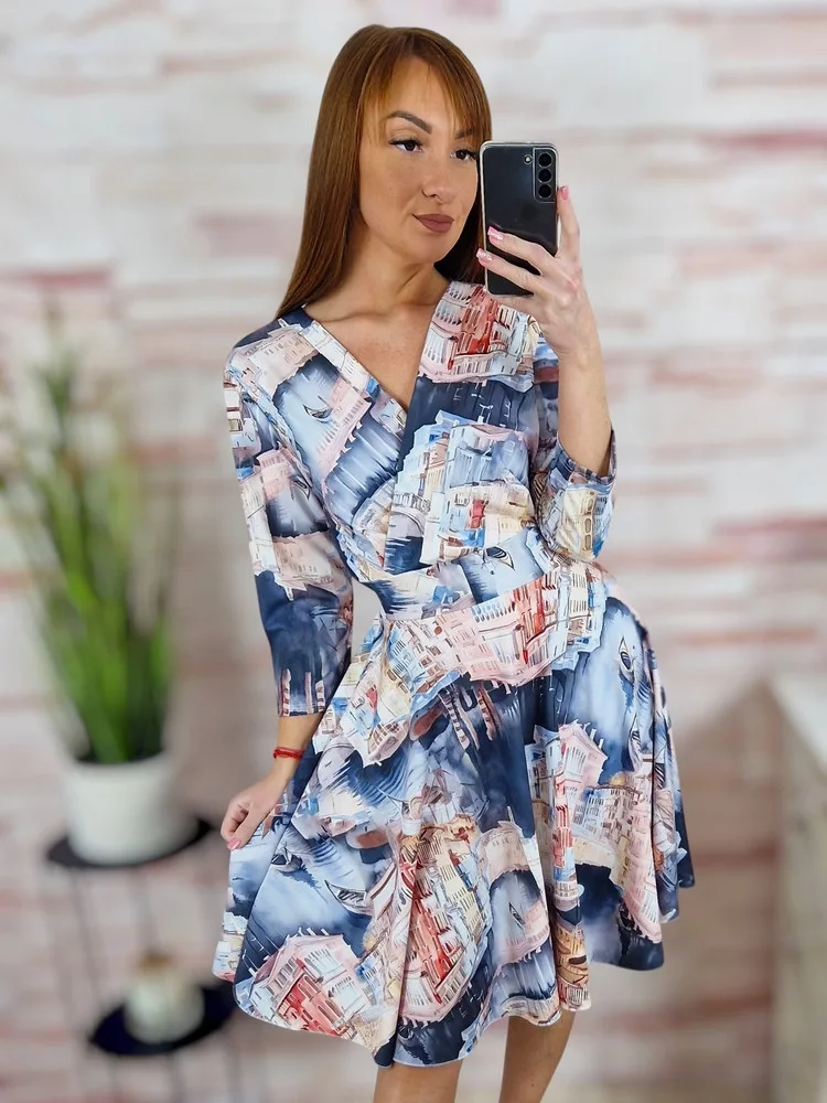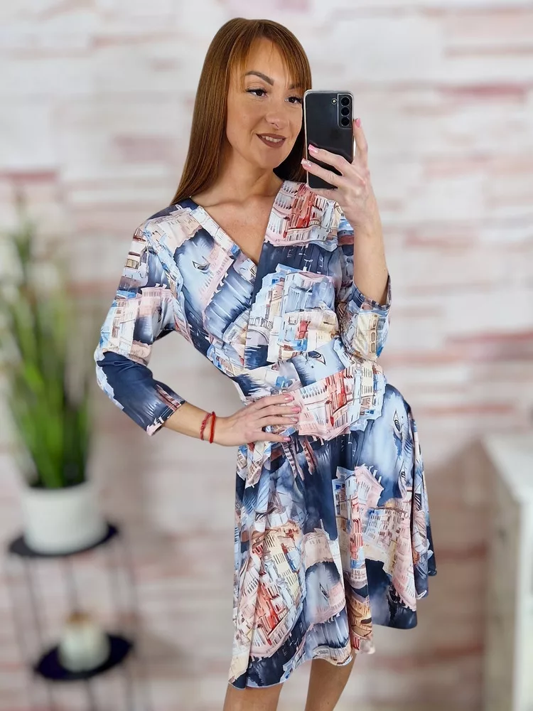 Városos mintás, mellnél átlapolt, loknis aljú ruha S-M