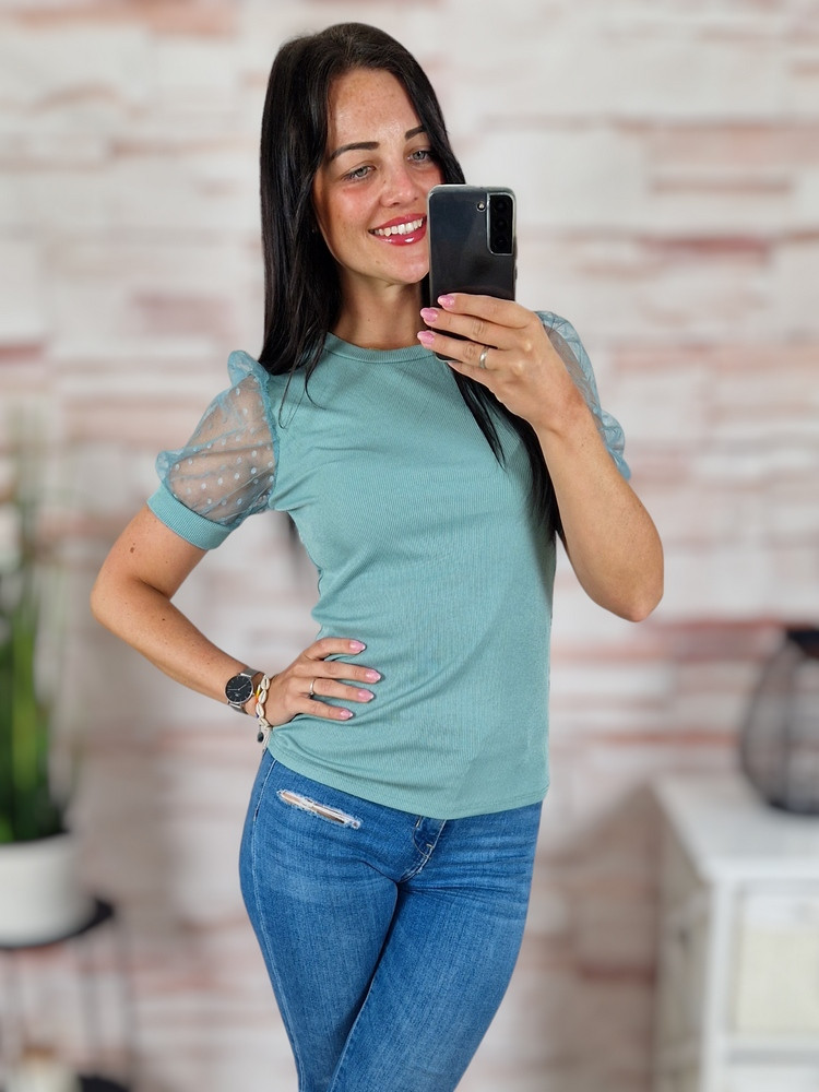 Pöttyös, tüllös és rövid ujjú, bordázott anyagú felső XS-S-M
