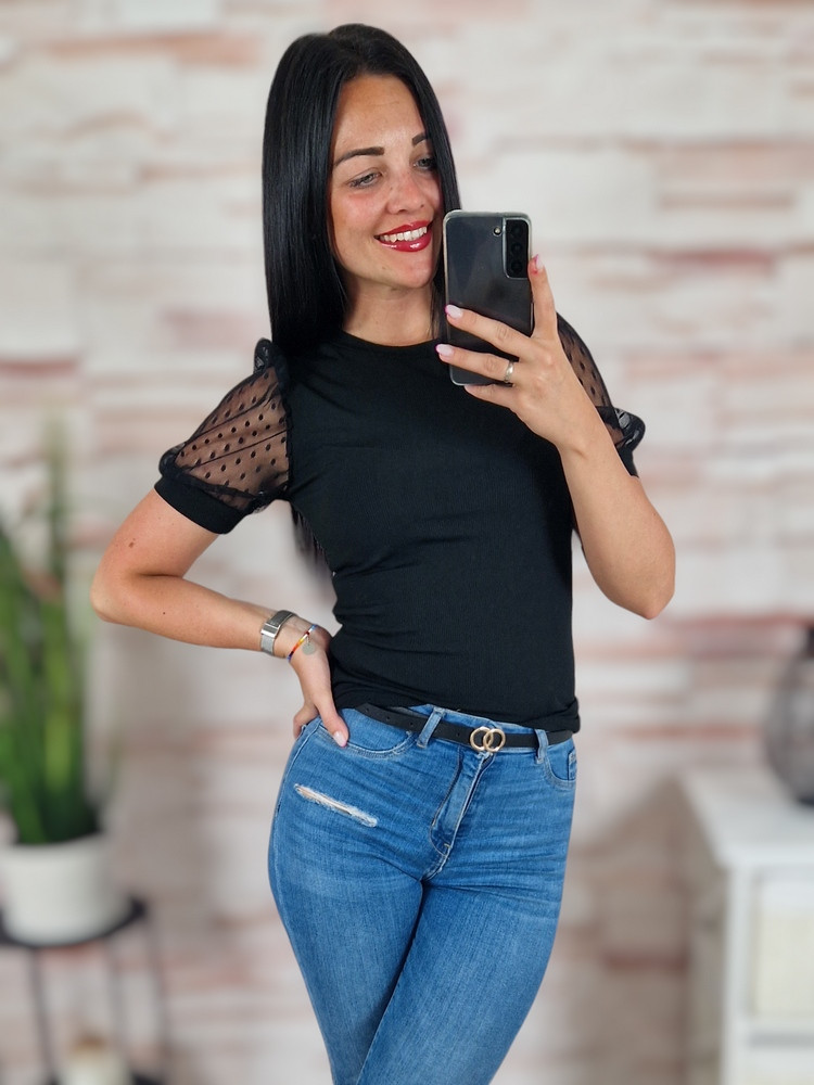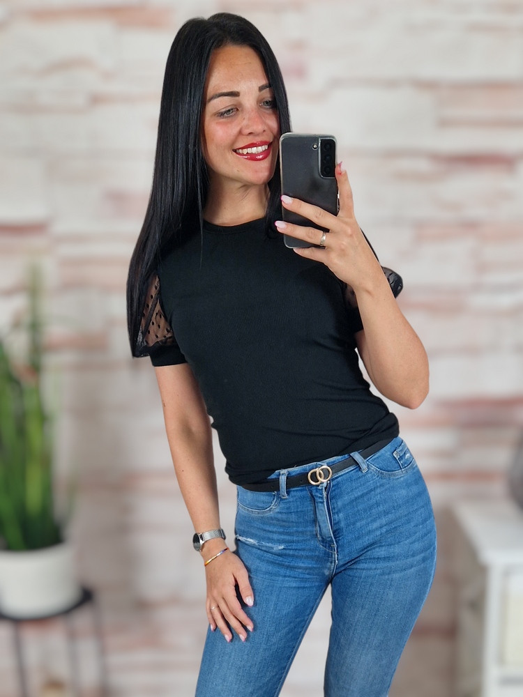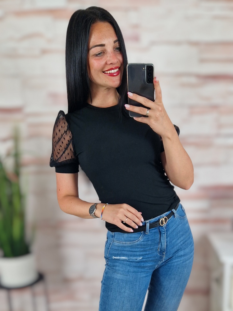 Pöttyös, tüllös és rövid ujjú, bordázott anyagú felső XS-S-M