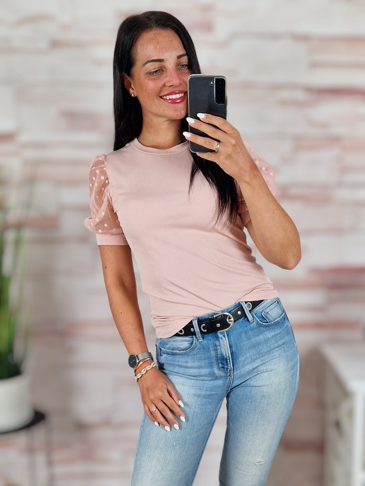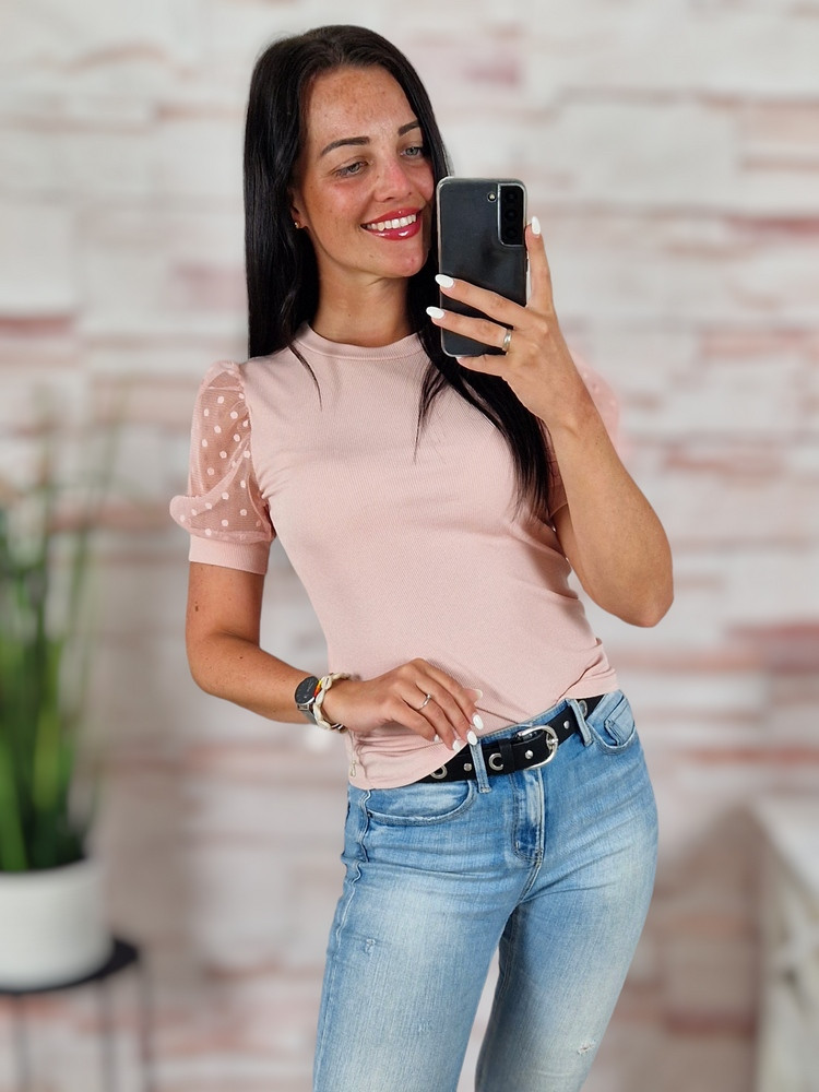 Pöttyös, tüllös és rövid ujjú, bordázott anyagú felső XS-S-M