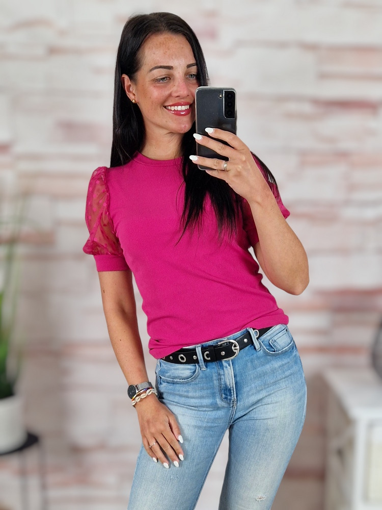 Pöttyös, tüllös és rövid ujjú, bordázott anyagú felső XS-S-M