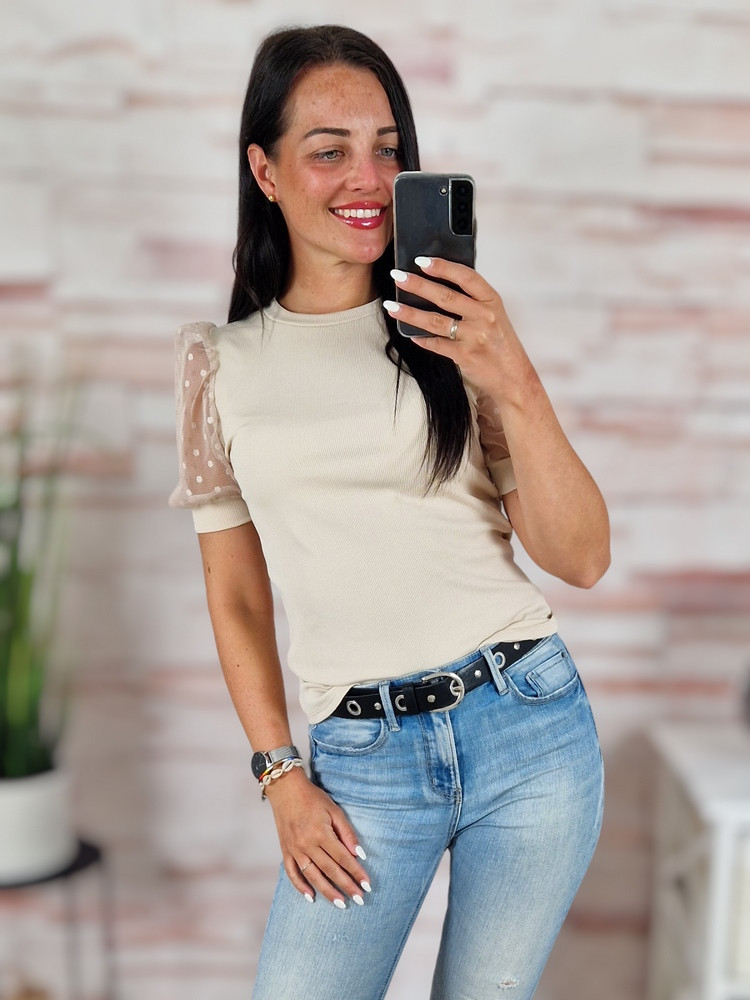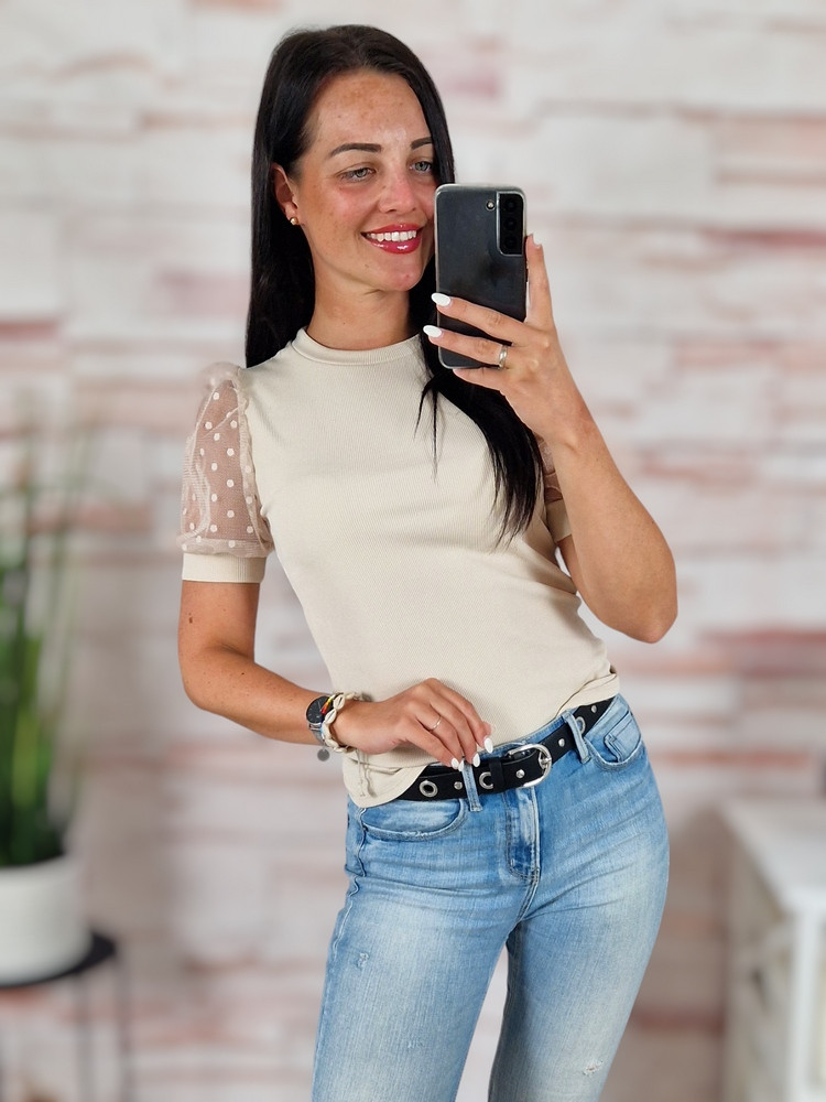 Pöttyös, tüllös és rövid ujjú, bordázott anyagú felső XS-S-M